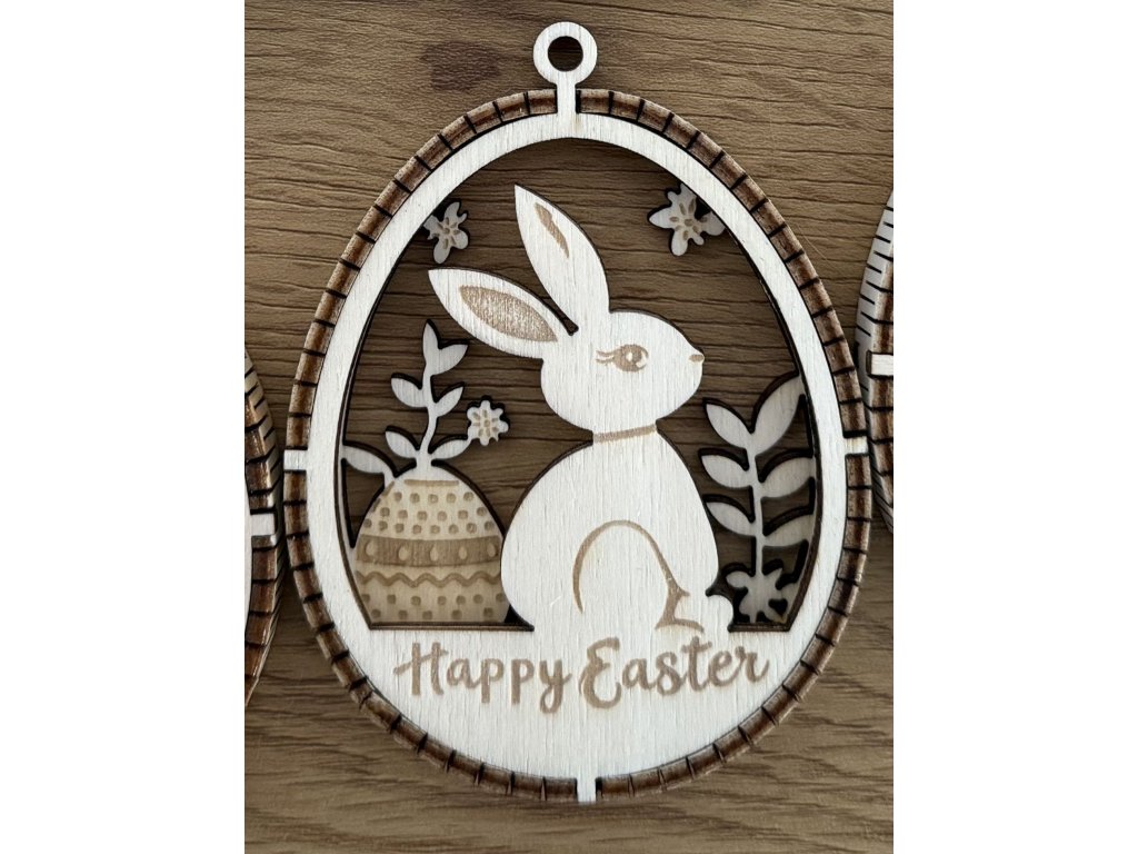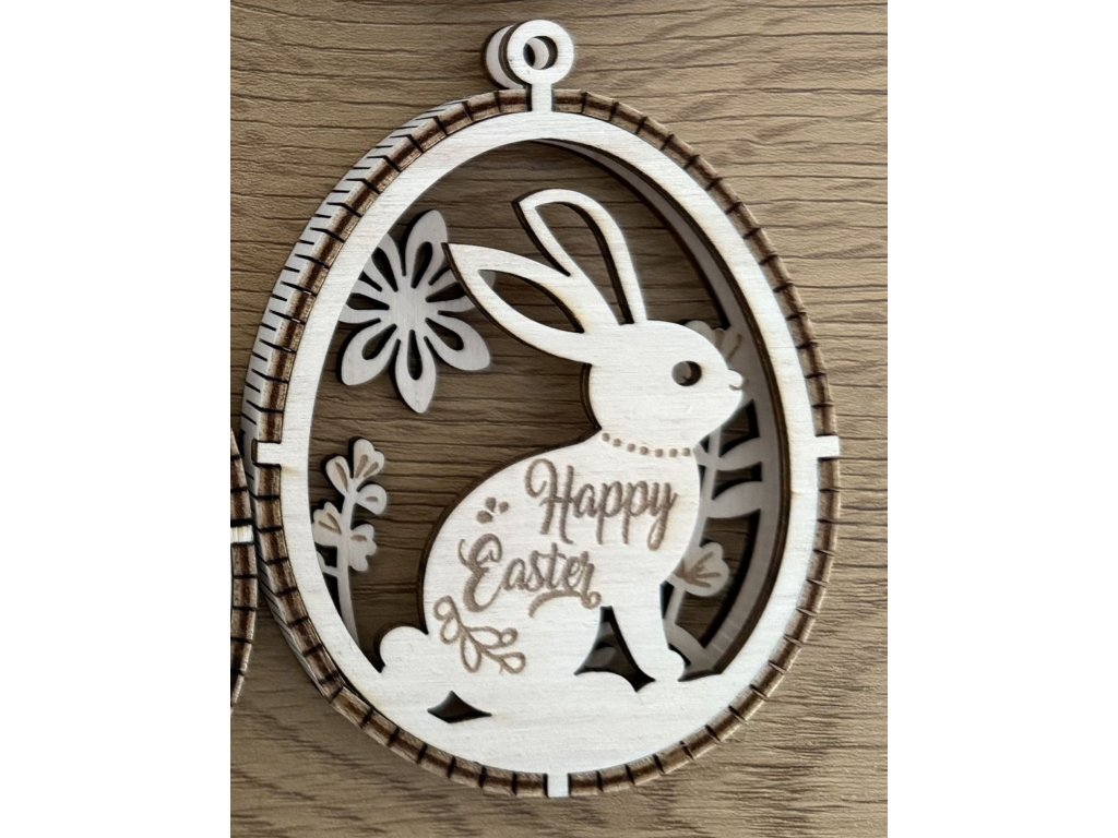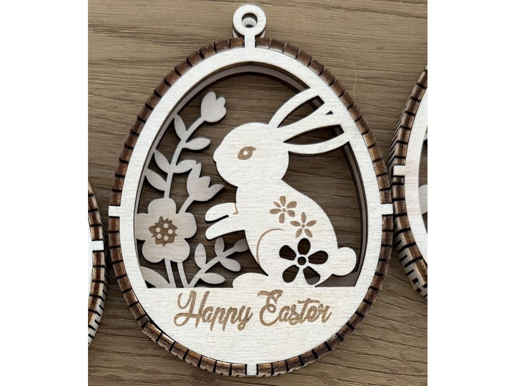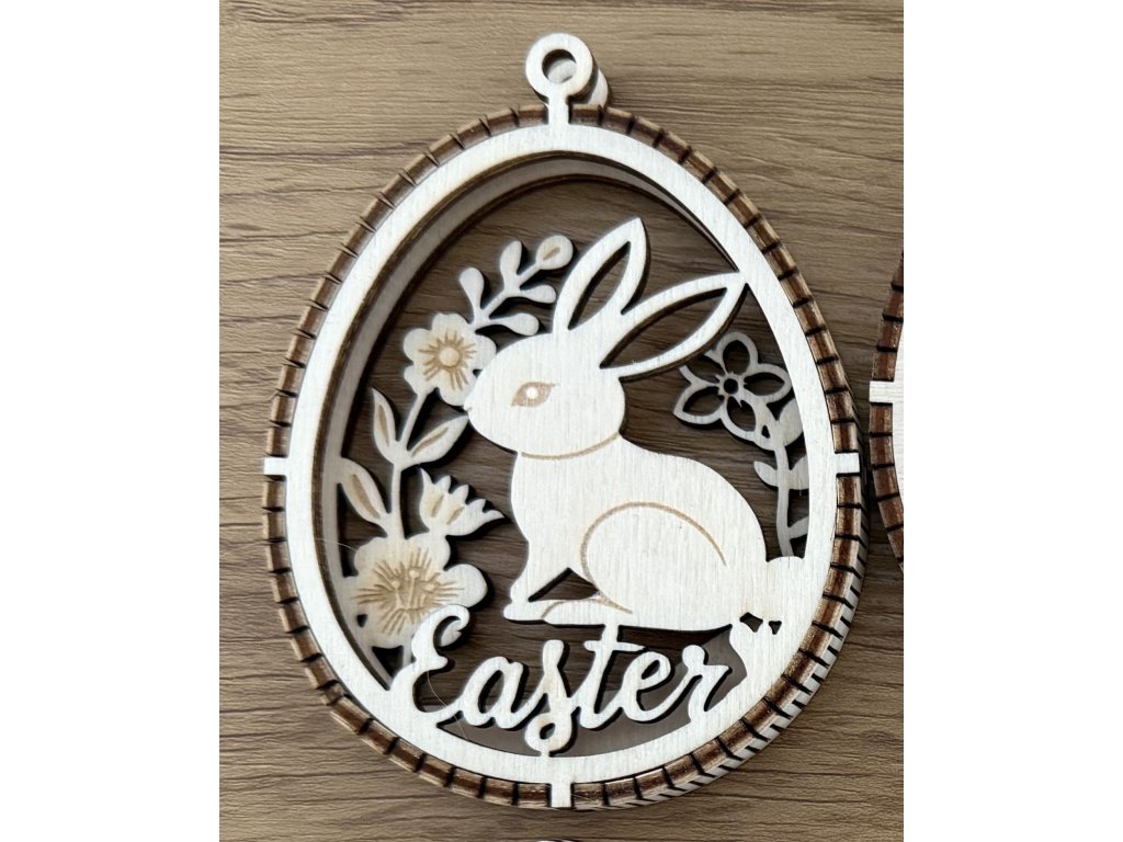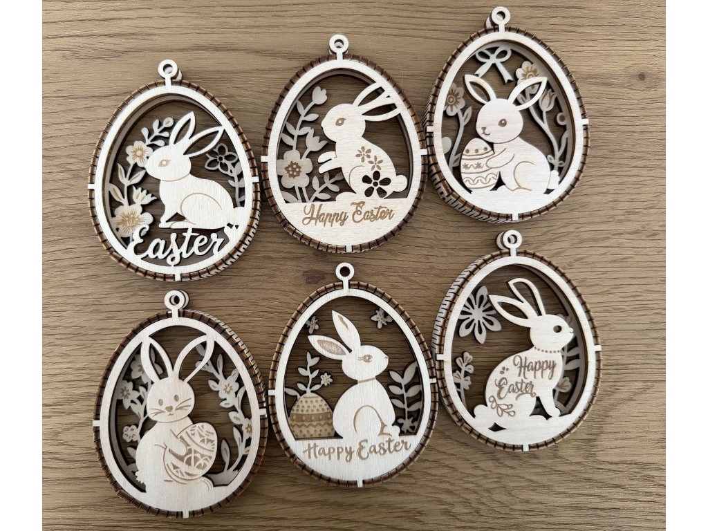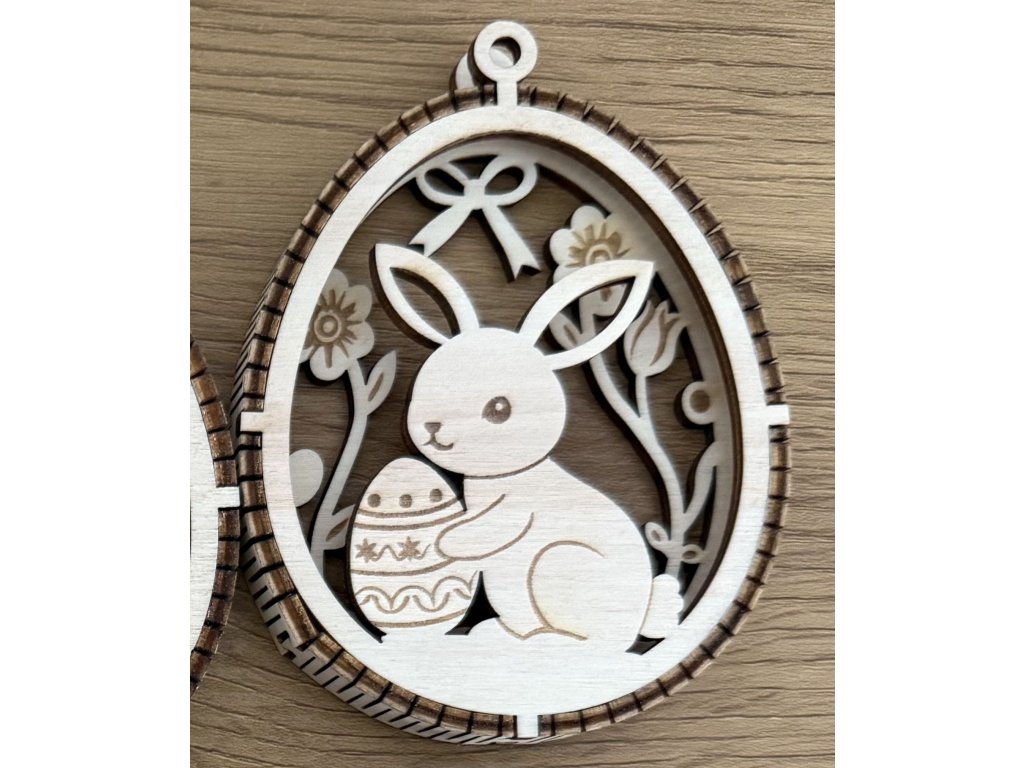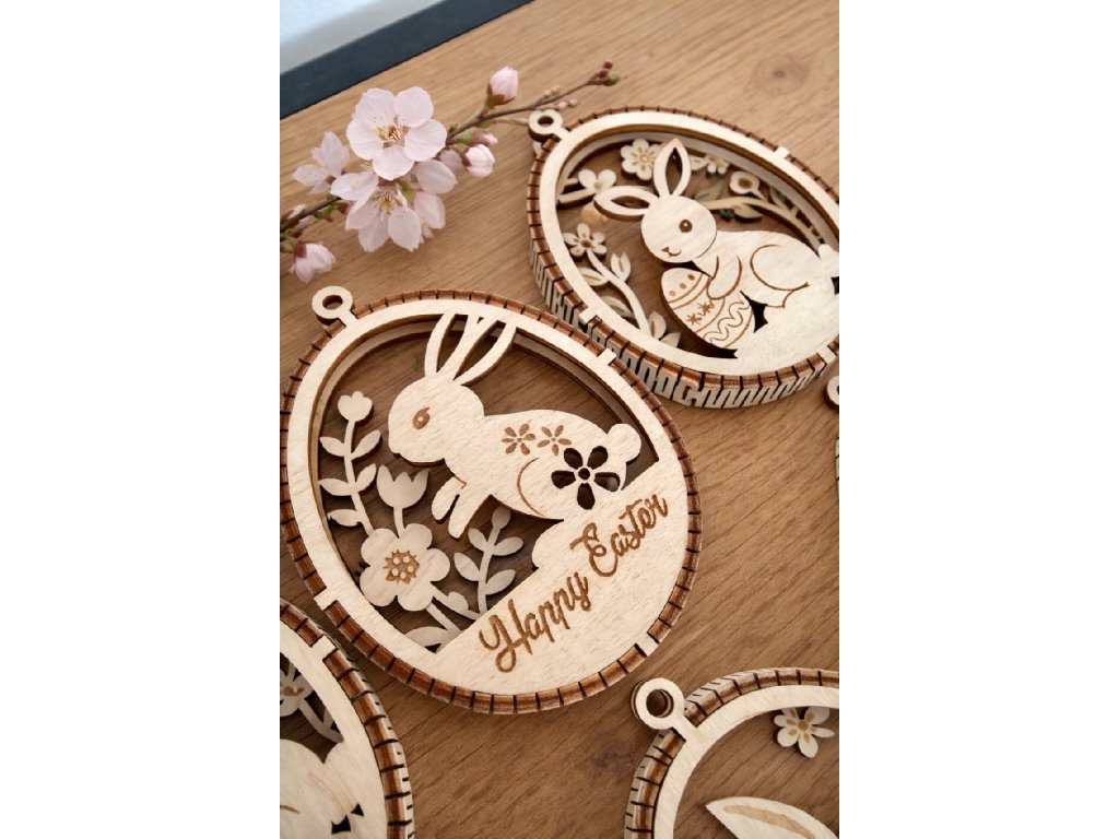 Jemné velikonoční ozdob z dřevěné překližky, které vynikají dvouvrstvým provedením s kontrastním proužkem uprostřed, díky němuž vzniká elegantní 3D efekt. Motivy roztomilých zajíčků, květin a velikonočních detailů jsou precizně vyřezané laserem a vytváří lehkou, vzdušnou dekoraci s přírodním charakterem.