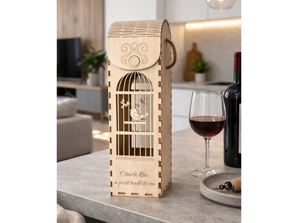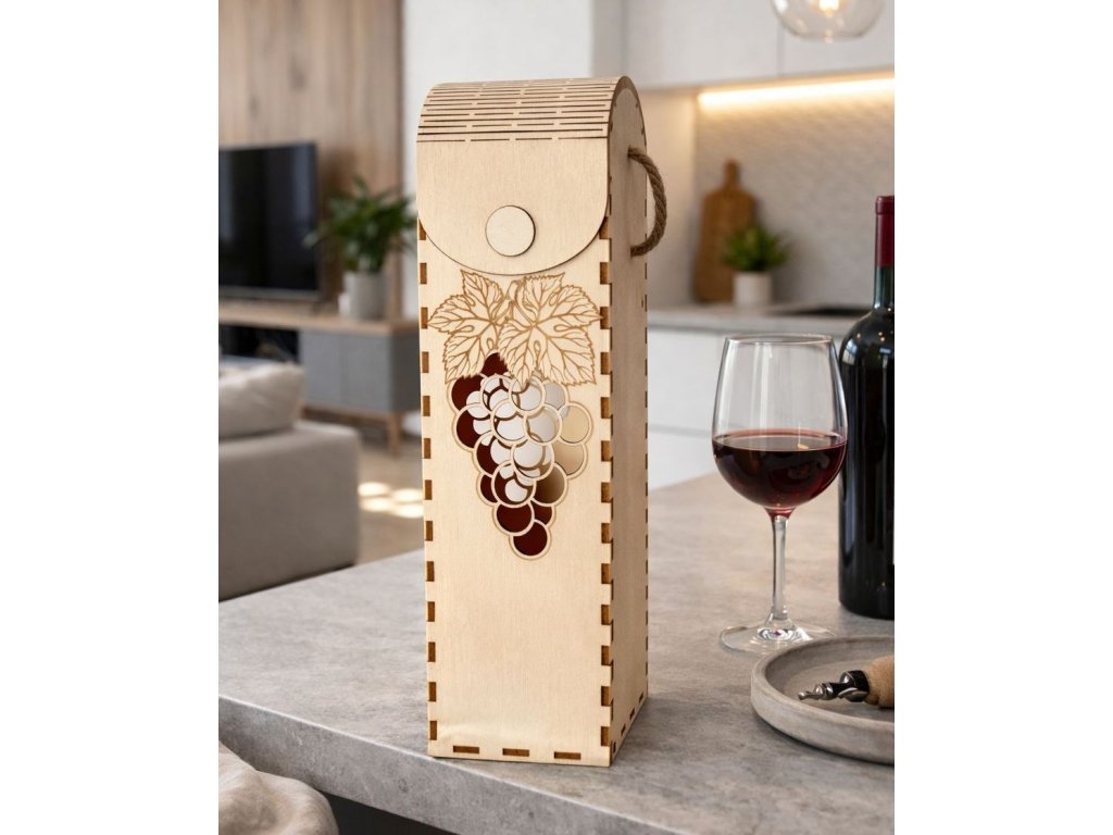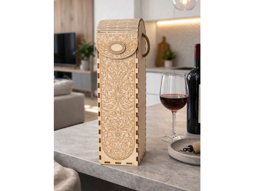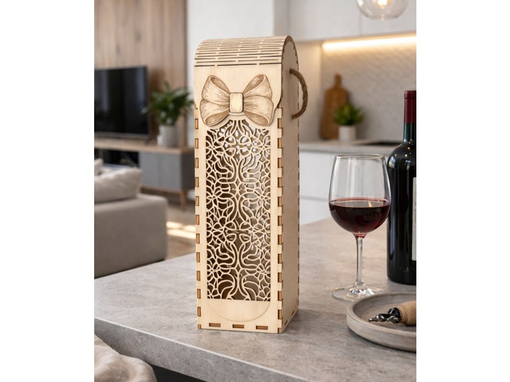 Precizně vyřezávané detaily, jemná kresba dřeva a praktické provazové ucho dělají z boxu nejen krásný, ale i funkční doplněk. Stačí vložit láhev a máte hotový dárek, který zaujme na první pohled.