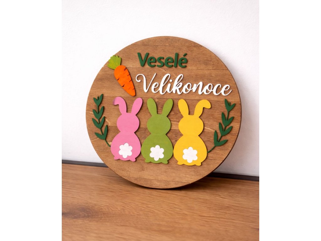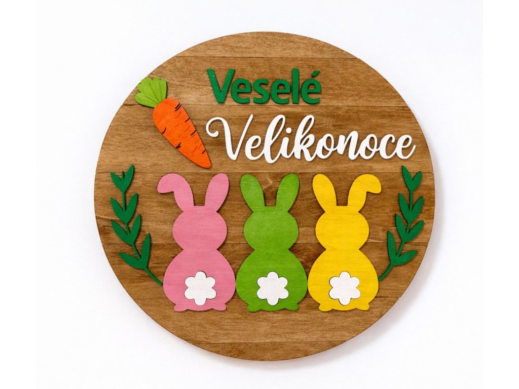 Jarní dekorace, která vykouzlí úsměv hned u dveří. Tři barevní zajíčci na dřevěné desce mořené do odstínu dubu přinášejí do domova hravou velikonoční náladu a přirozené kouzlo dřeva.