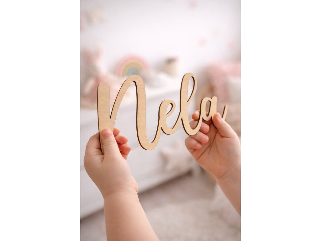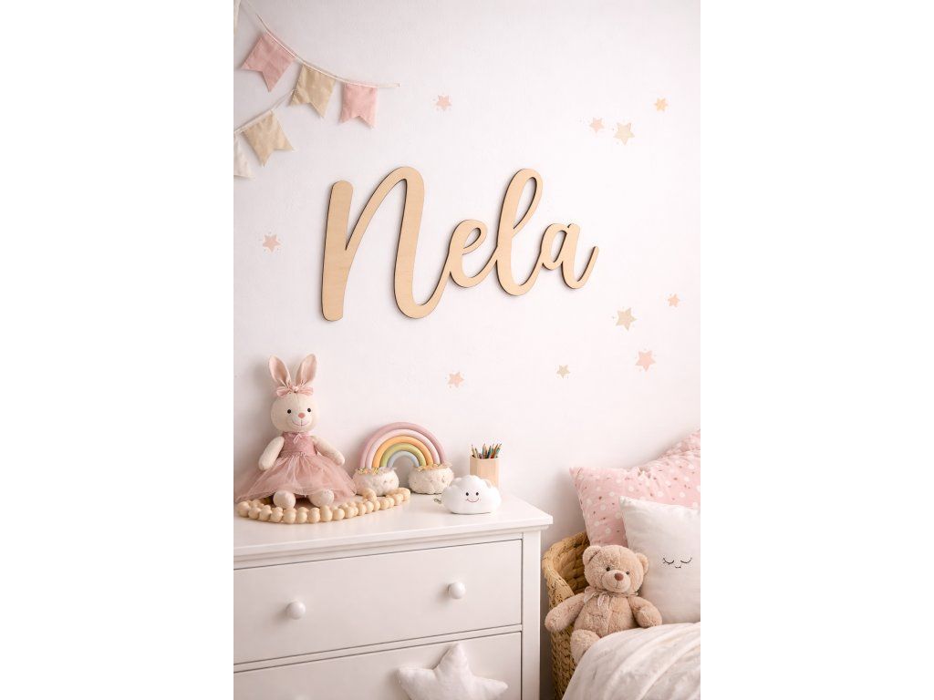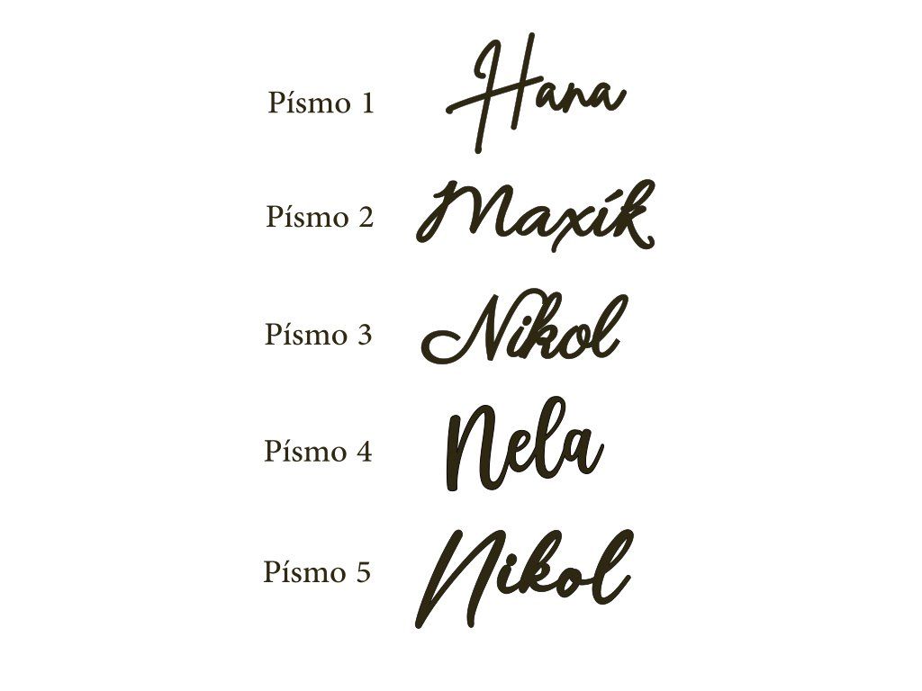 Každý nápis vyrábím na míru - můžete si vybrat nejen jméno, ale i velikost a styl písma, aby dokonale ladil s vaším interiérem. Výběr písma uveďte v poznámce při odeslání objednávky. Přírodní dřevo působí jemně, nadčasově a krásně vynikne nad postýlkou, postelí nebo komodou.