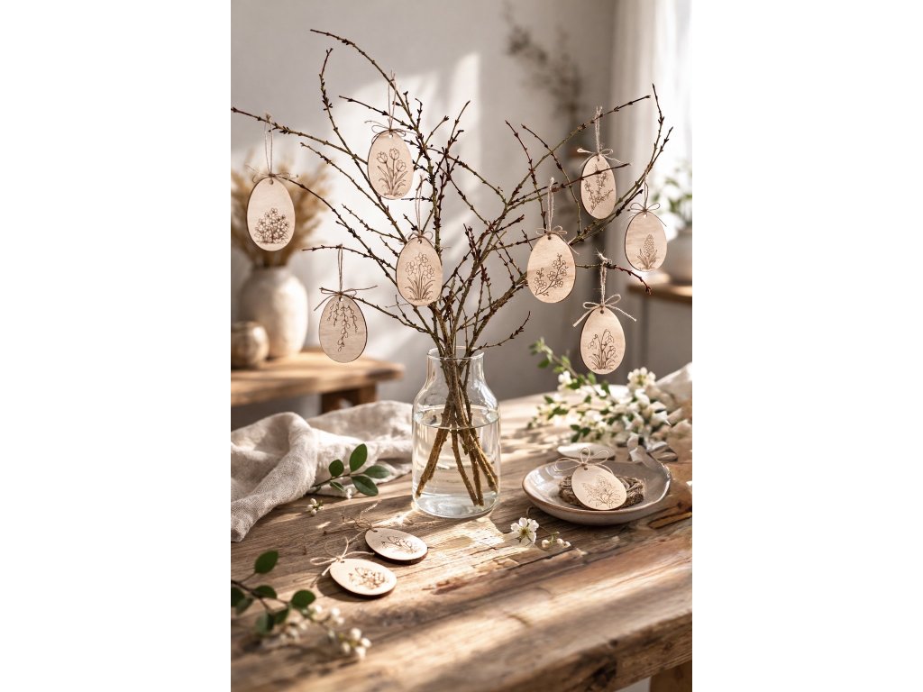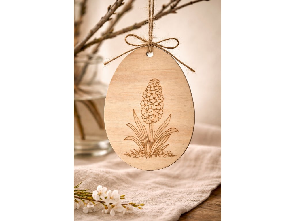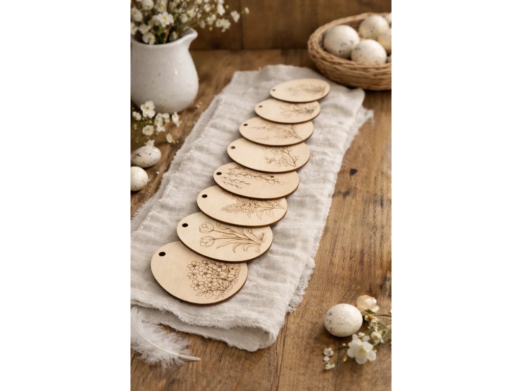 Každé vajíčko vzniklo podle mého vlastního autorského návrhu, který nenajdete nikde jinde. Precizní gravírování zvýrazňuje jemné linie květů a podtrhuje přírodní charakter světlého dřeva. Díky minimalistickému zpracování působí ozdoby velmi čistě a elegantně.