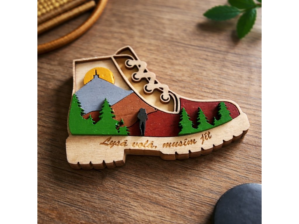 Magnetka má vrstvený, lepený a ručně malovaný design ve tvaru turistické boty. V jednotlivých vrstvách se prolíná Lysá hora, les, silueta turisty a slunce, které vytvářejí plastický a živý obraz. Na podrážce se vygravírovaný nápis "Lysá volá, musím jít", který vystihuje přesně ten pocit, kdy hory zkrátka volají.