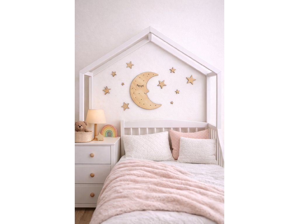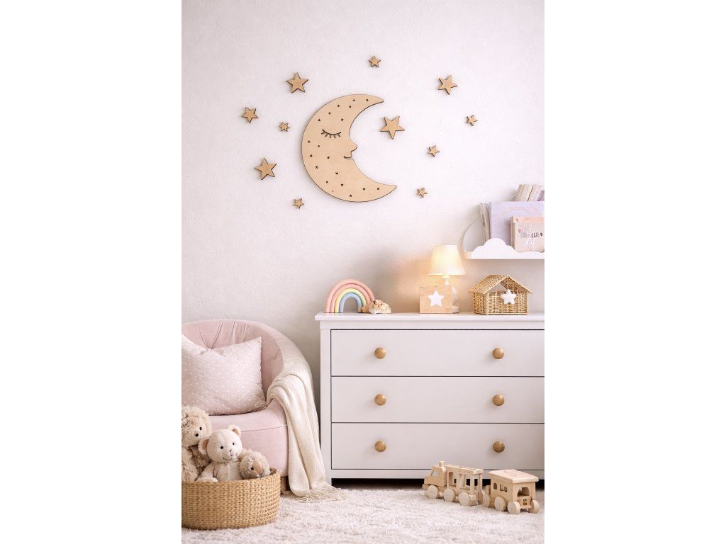 Proměňte dětský pokoj v klidné místo, kde každý večer začíná pohádkovým usínáním. Dřevěná dekorace měsíce s hvězdami přináší jemnou atmosféru noční oblohy a pocit bezpečí, který děti milují.