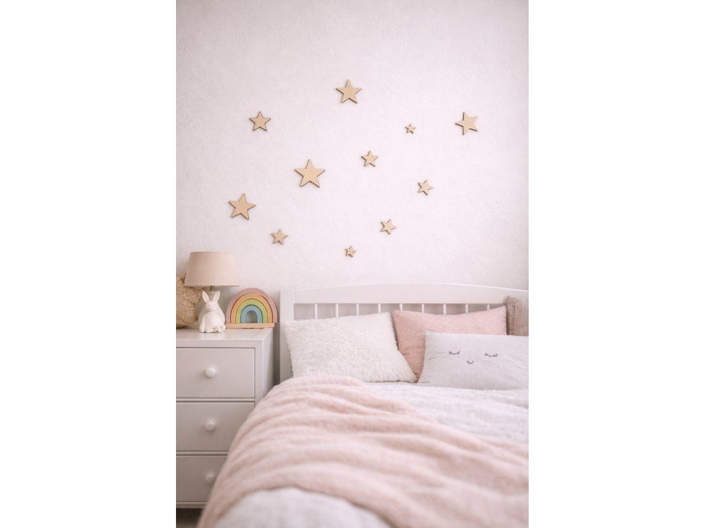 Jednoduchý detail, který vytvoří kouzelnou atmosféru během pár minut. Sada dřevěných hvězdiček přinese na zeď jemnou noční oblohu a zútulní prostor nad postýlkou i v hracím koutku.