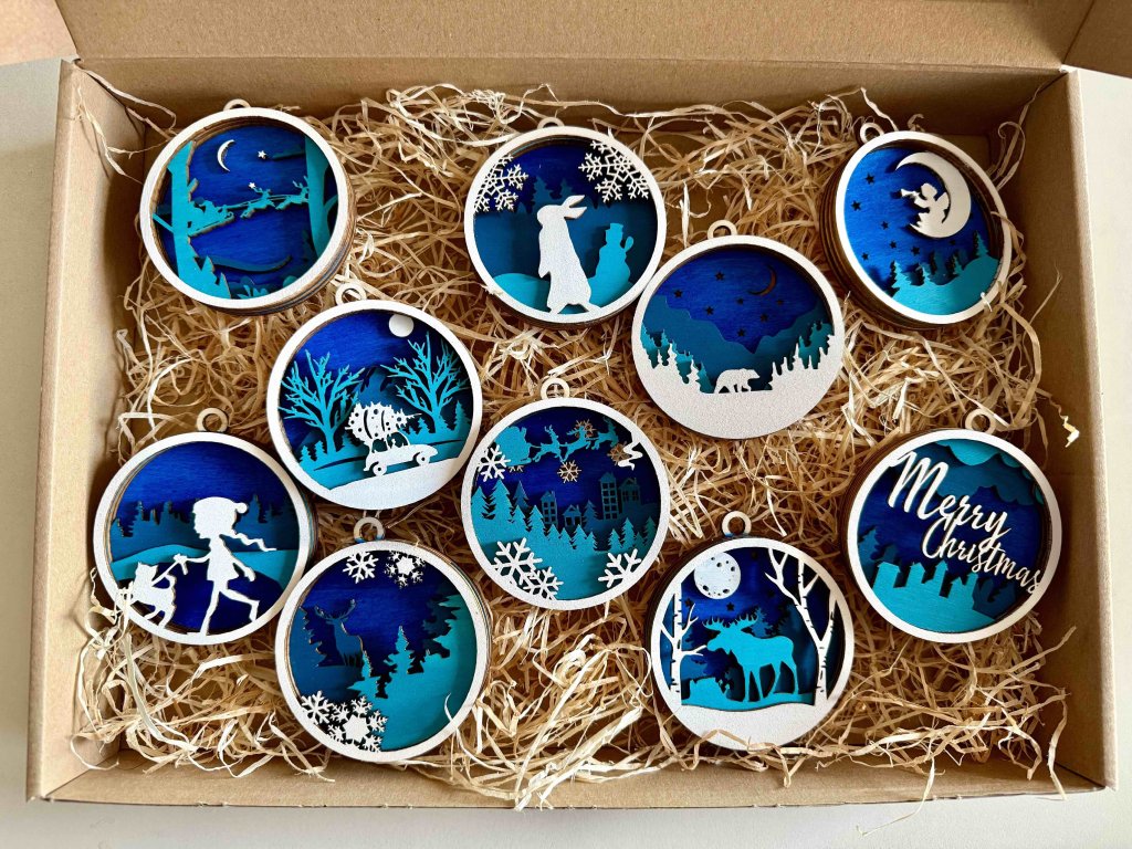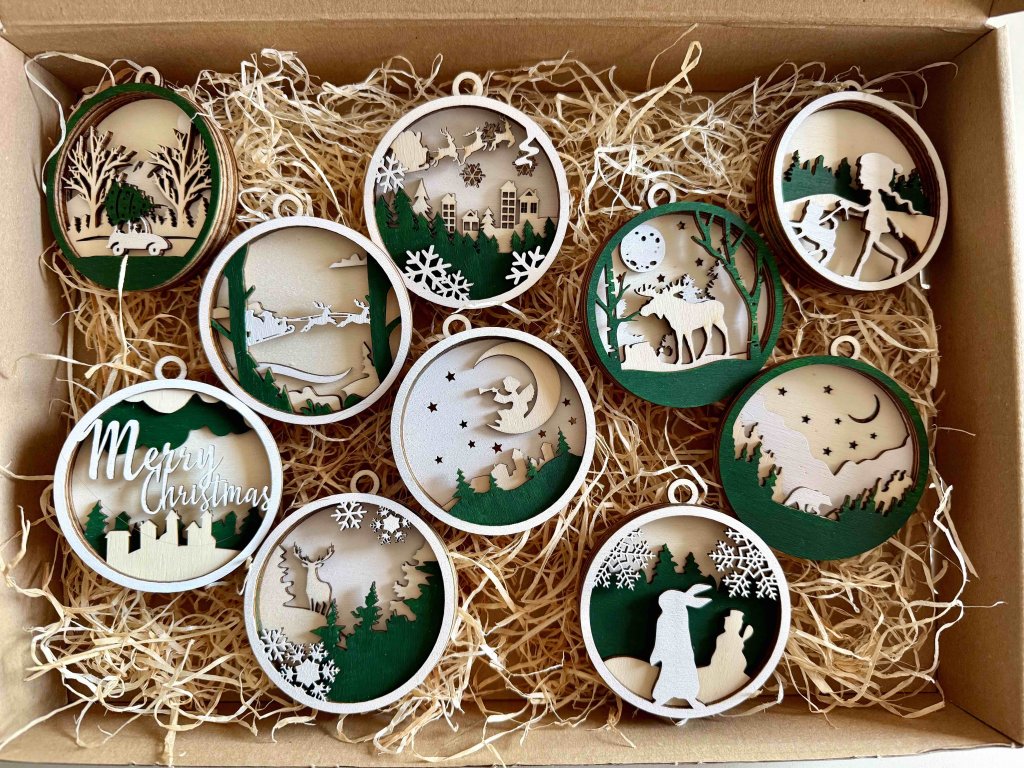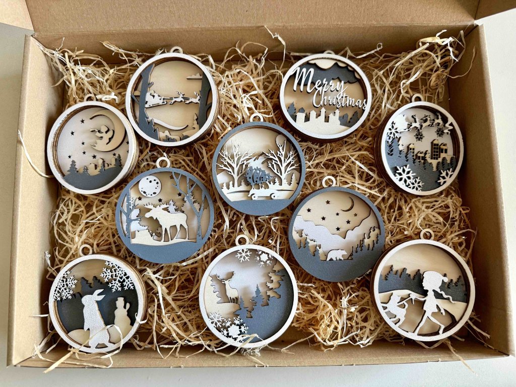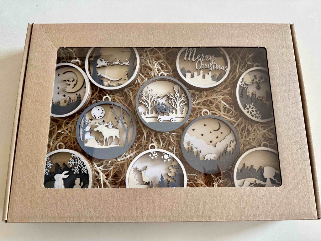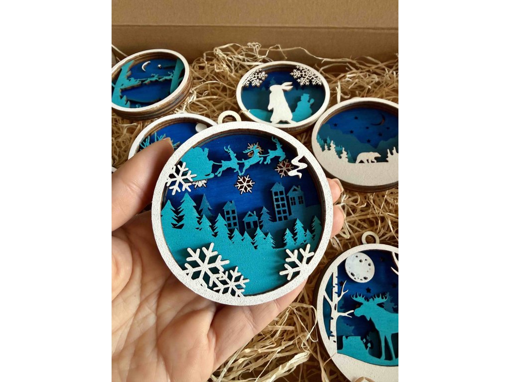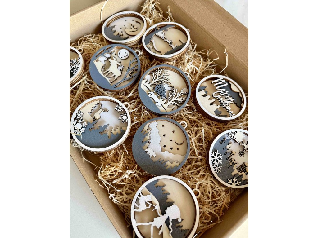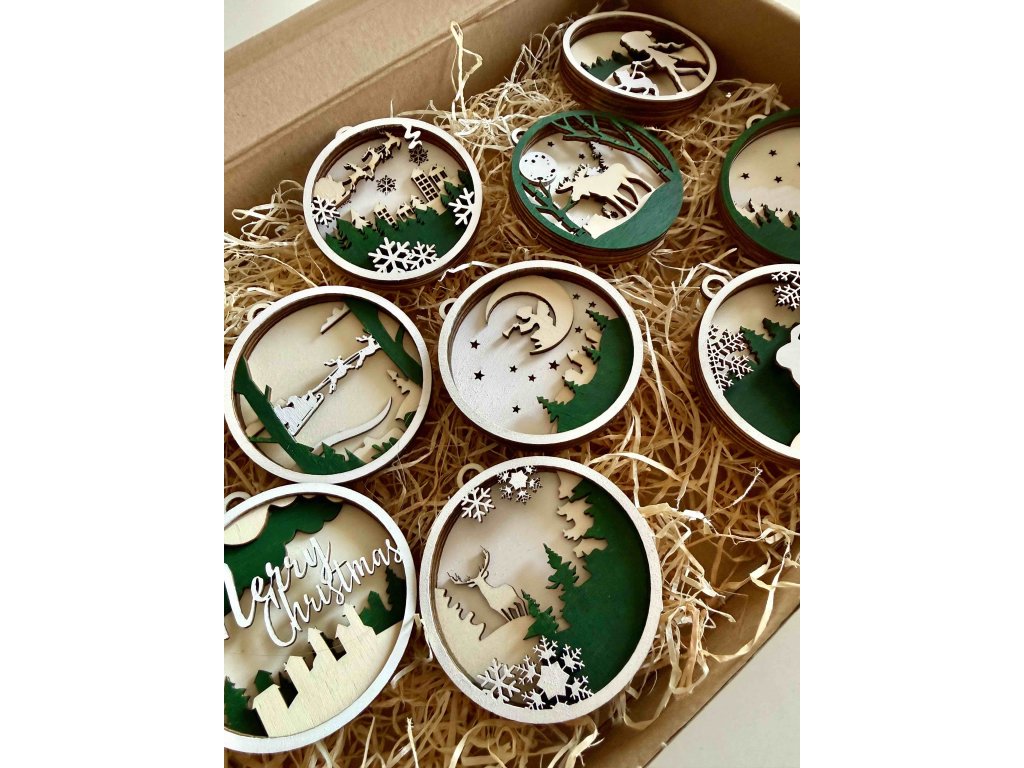 Přineste kouzlo Vánoc do svého domova s ručně malovanými 3D vánočními baňkami. Každá baňka je tvořena čtyřmi pečlivě vrstvenými díly překližky, které dodávají jedinečný prostorový efekt a realistický vzhled.