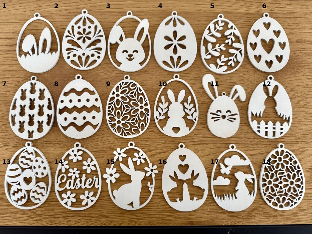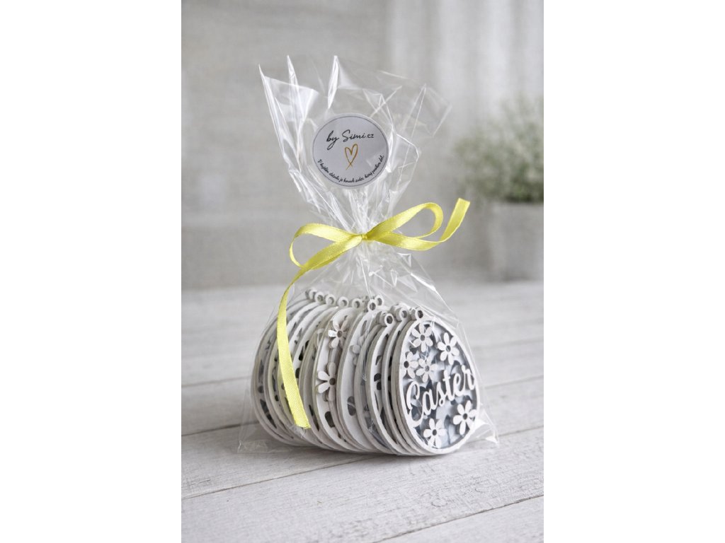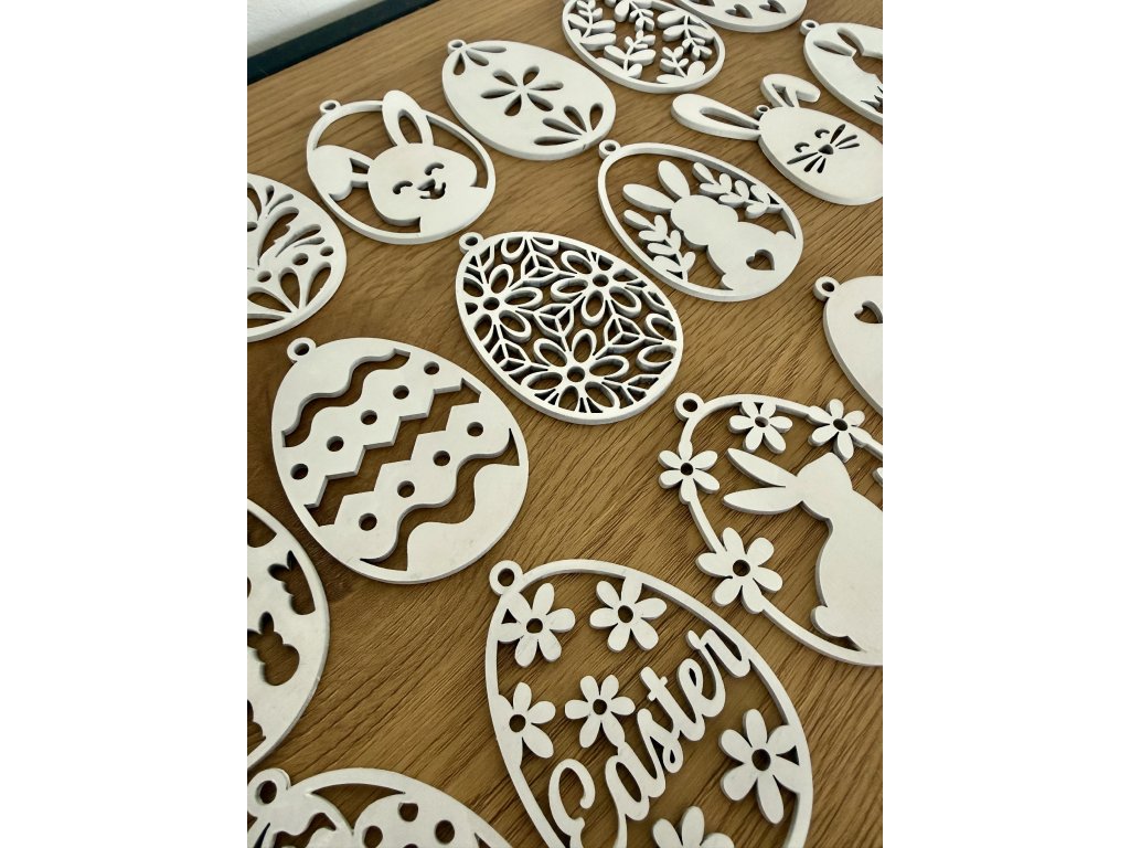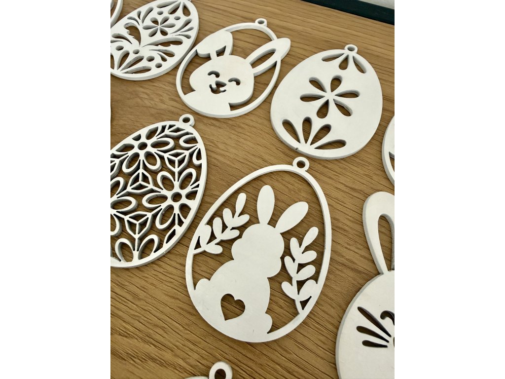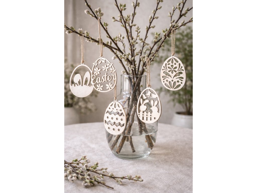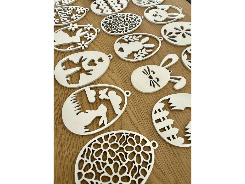 Elegantní dřevěná velikonoční vajíčka v bílé barvě, s jemně vyřezávanými motivy jsou nadčasovou dekorací pro jarní a velikonoční výzdobu. Každé vajíčko je vyrobeno z kvalitní překližky, zdobeno detailními výřezy s motivy zajíčků, květin, srdcí a tradičních velikonočních vzorů.