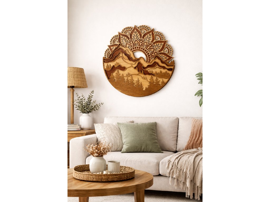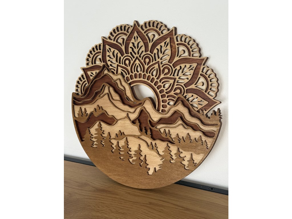 Dřevěná mandala s motivem hor a lesa je výraznou dekorací, která propojuje symboliku mandaly s klidem horské krajiny. Mandala je vyrobena ze 4 vrstev překližky, které jsou lepené do prostorového 3D efektu. Povrch je mořený do přírodních odstínů dubu, díky čemuž vyniká kresba dřeva i hloubka jednotlivých vrstev.
