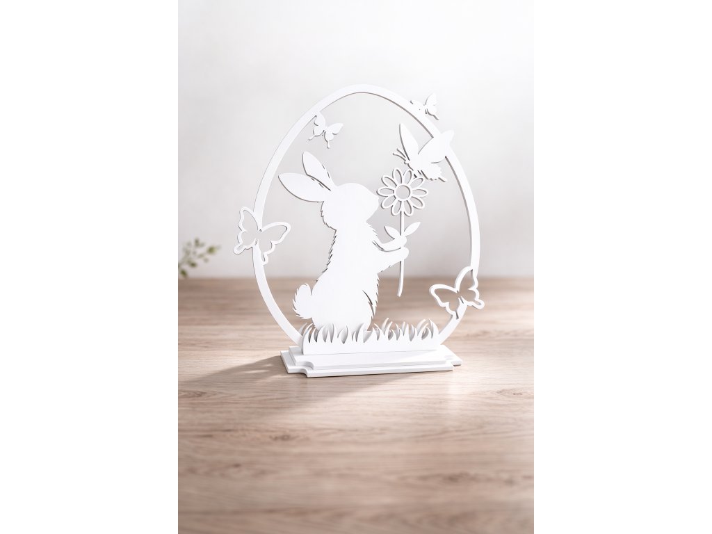 Zajíček držící květinu, doplněný poletujícími motýly a jemnou travičkou , vytvoří kouzelné zákoutí na poličce, komodě i svátečním stole.