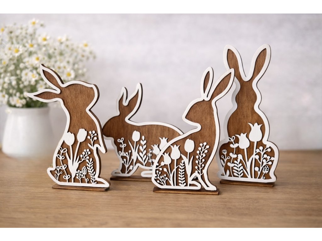 Stylová velikonoční dekorace, která vynikne svou jemností i přírodním vzhledem. Sada čtyř dřevěných zajíčků mořených do teplého odstínu ořechu je doplněna kontrastním bílým detailem s jarními motivy, které celé dekoraci dodávají něžný a čistý charakter.