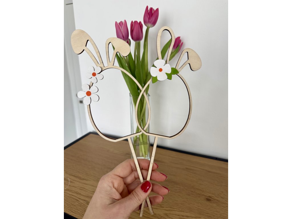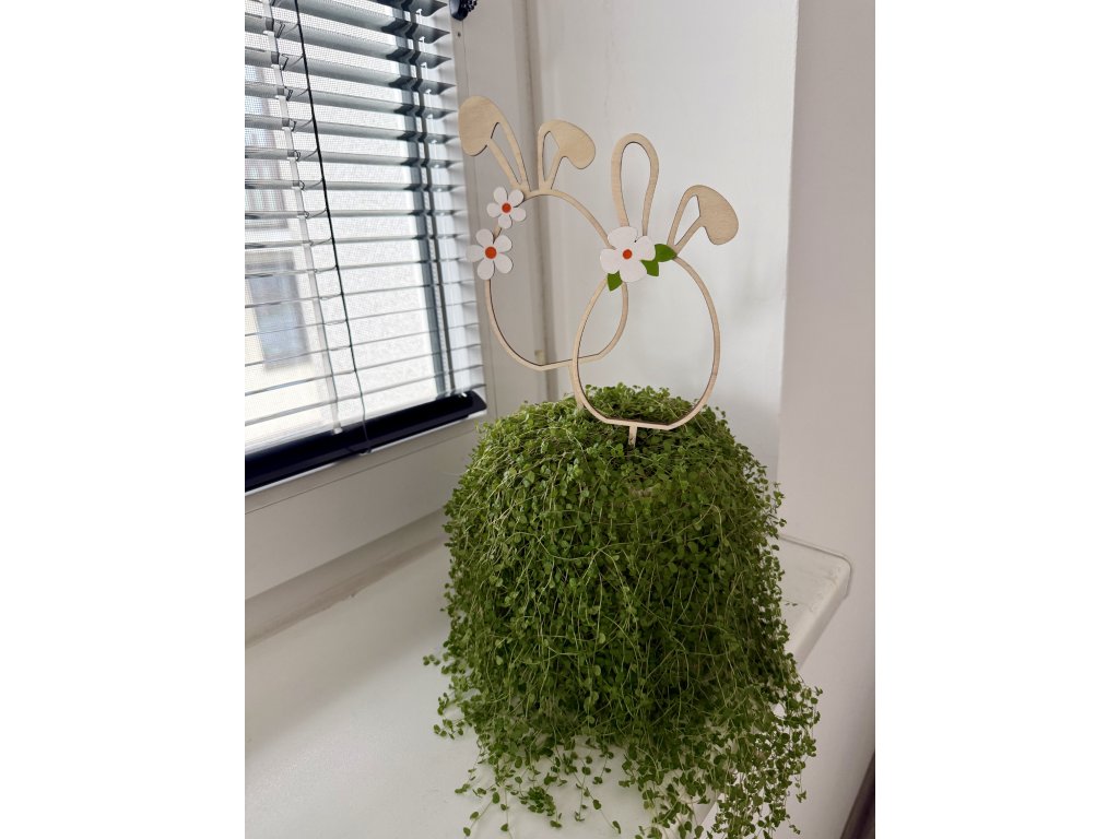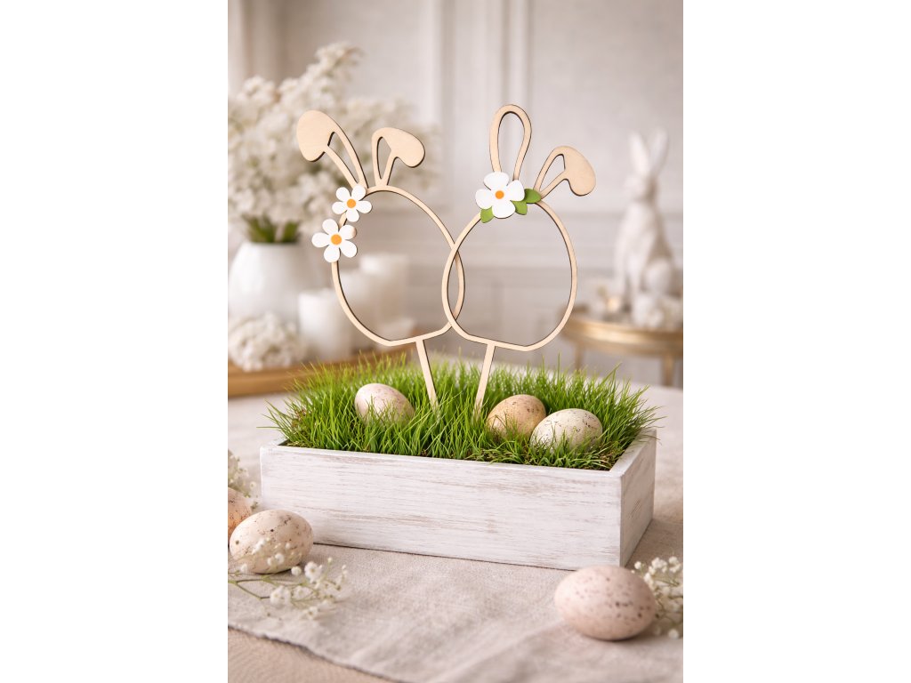 Elegantní dřevěné zápichy ve tvaru zajíčků jsou jemnou a nadčasovou dekorací pro jarní i velikonoční aranžmá. Přírodní překližka v kombinaci s drobnými kvítky vytváří lehký, harmonický vzhled, který krásně vynikne v truhlíku, květináči i svátečním aranžmá na stole.